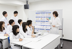 低年次からの思考力育成型演習(ロジカル思考演習)の実践と並行して薬学の基礎から臨床に関する知識の修得を経て、長期実務実習(病院実習・薬局実習)を目前にした4年次において、実習前の総仕上げとして、「薬学的症例解析演習」(課題解決型演習(PBL))で考え抜く力を養います。