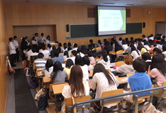1年次に学習のモチベーションを高めるとともに、早い段階から医療人としての自覚を持つために行う体験学習です。病院、調剤薬局、製薬企業、公的機関、福祉施設などを少人数のグループに分かれて訪問し、薬剤師の実際の職場や業務を見学します。訪問後は体験した内容についてグループに分かれてスモールグループディスカッション(SGD)を行い、クラスや全体でプレゼンテーションを実施することで体験を共有します。