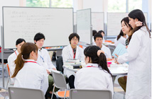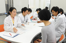 5年次の臨床現場における長期実務実習に備え、4年次には実務実習事前教育として薬剤師業務の実際を講義・実習・演習形式で受講します。事前教育は、医療機関や薬局の薬剤師も指導に加わり、中規模病院薬剤部の設備を備えた総合教育研究センター(臨床部門)を利用して臨場感あふれる形で行われます。具体的には、模擬症例による処方せんに基づく調剤や院内製剤の調製、模擬患者への服薬コミュニケーション指導、医薬品情報の解析などのシミュレーション実習を行うとともに、小グループに分かれてのスモールグループディスカッション(SGD)を取り入れ、協調性、積極性、コミュニケーション力やプレゼンテーション能力の育成を行います。